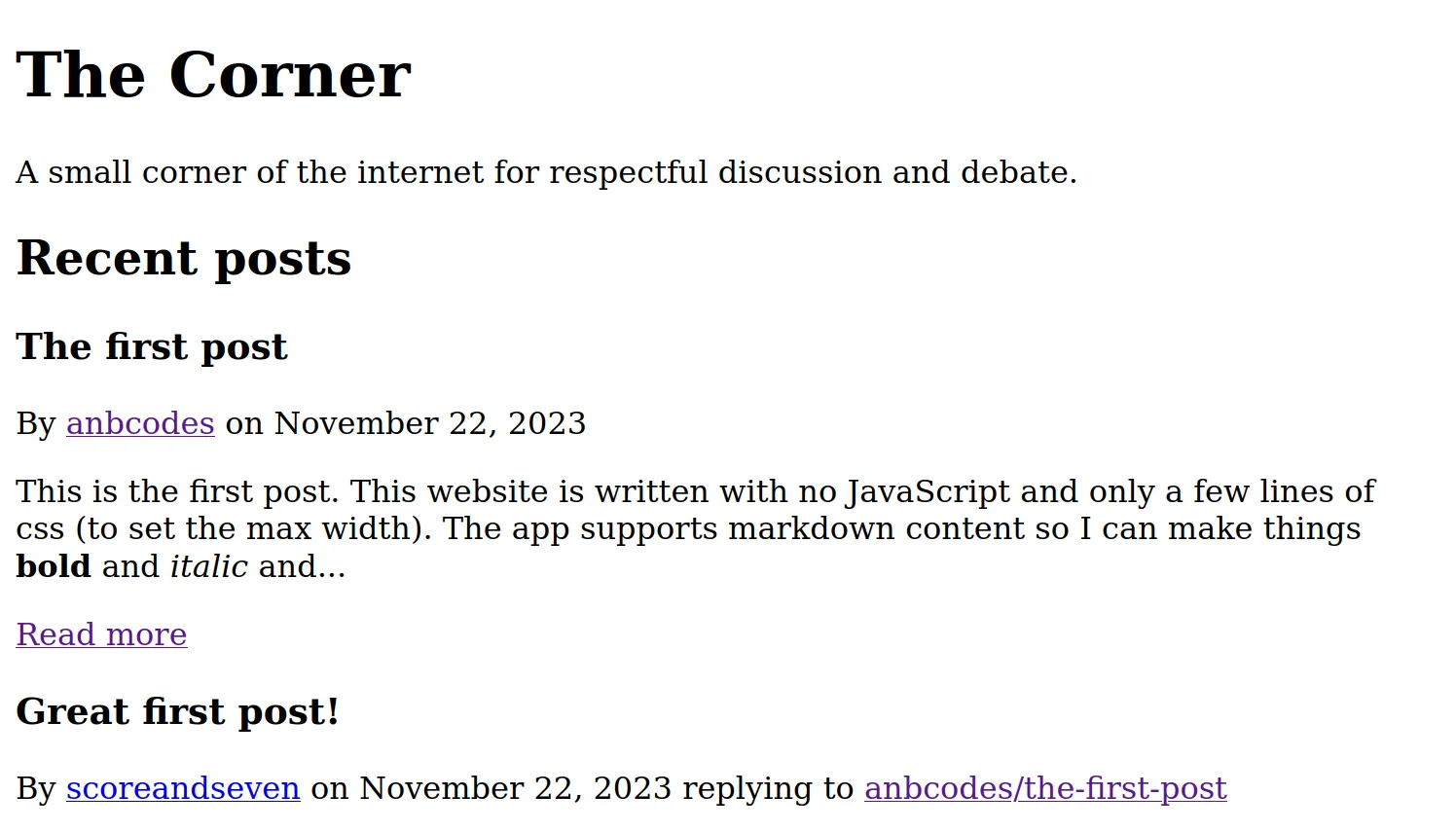 The Corner is a no (frontend) JS, no CSS website built using NodeJS. The backend uses the filesystem as a database to store the accounts, posts and replies.